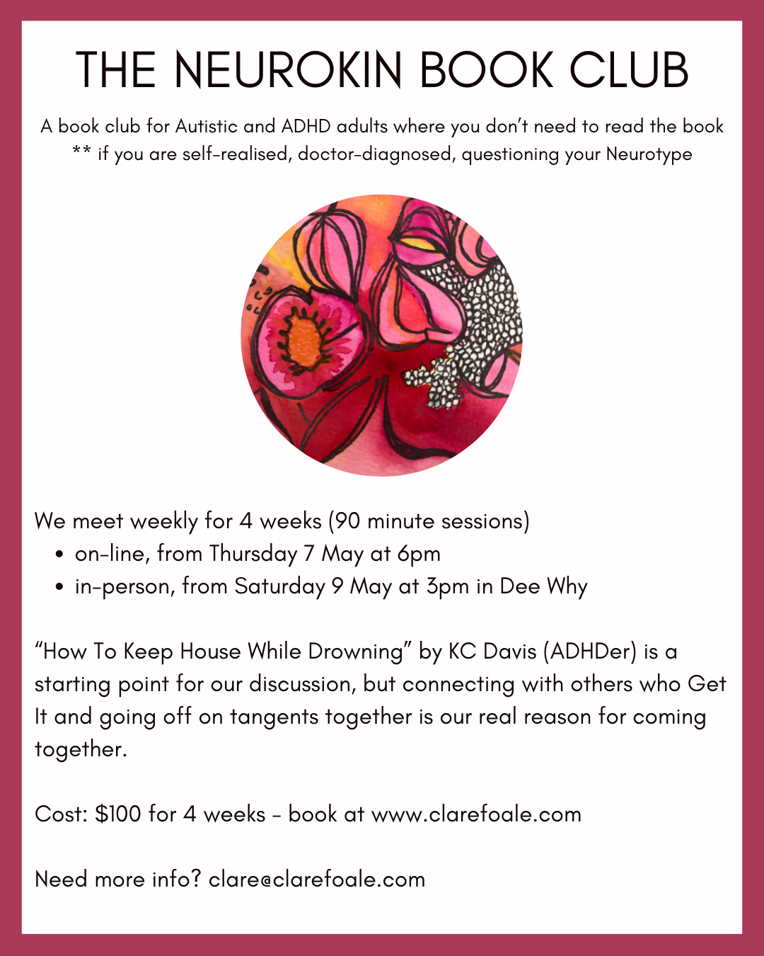 “How To Keep House While Drowning” by KC Davis (ADHDer) is a starting point for our discussion, but connecting with others who Get It and going off on tangents together is our real reason for coming together.